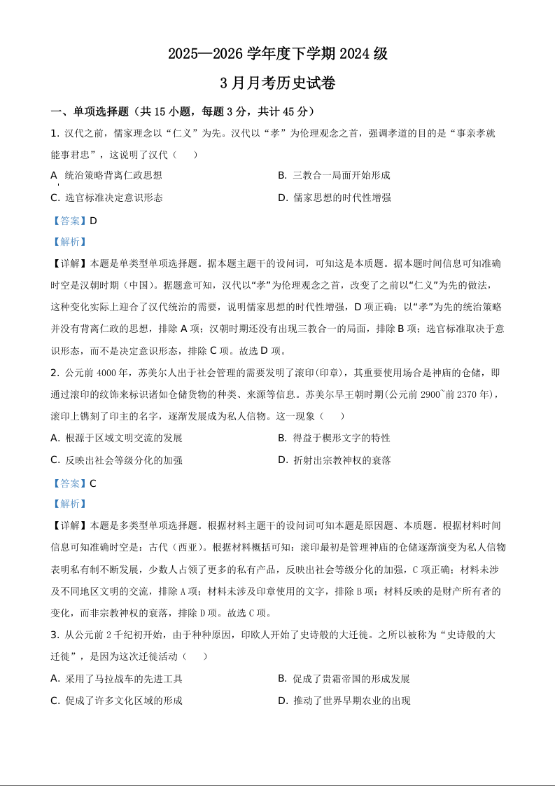 湖北省荆州市沙市中学2025-2026学年高二下学期3月月考 历史答案.docx