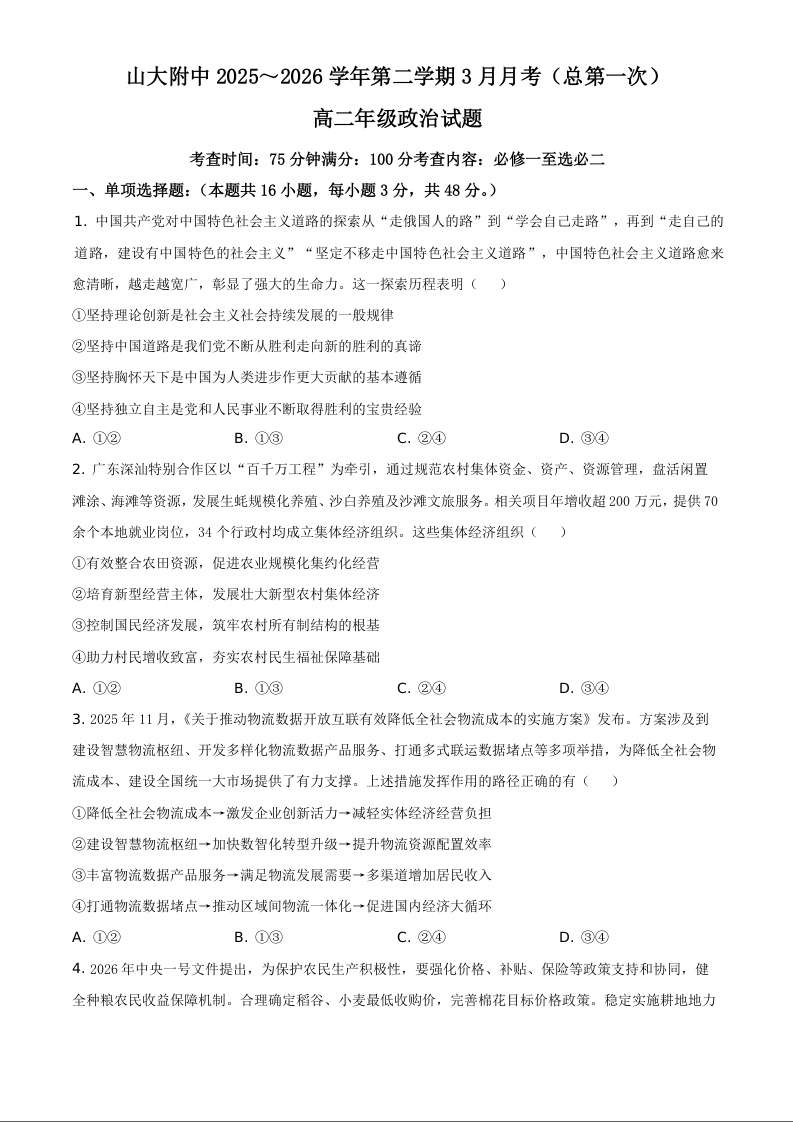 山西大学附属中学校2025-2026学年高二下学期3月阶段检测 政治.docx
