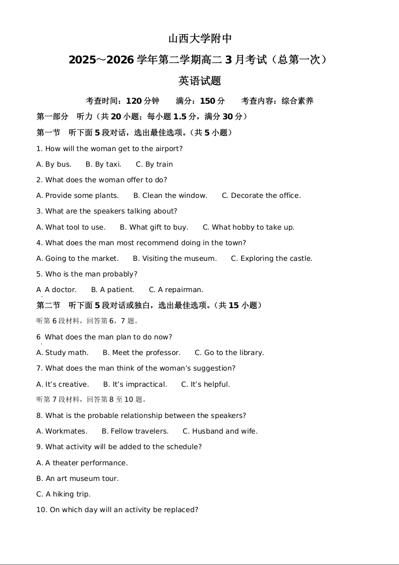 山西大学附属中学校2025-2026学年高二下学期3月阶段检测 英语答案.docx
