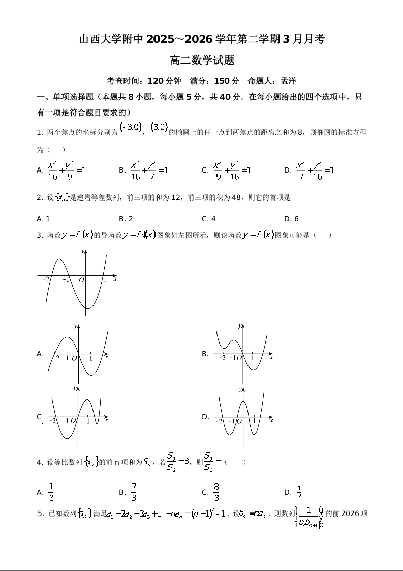 山西大学附属中学校2025-2026学年高二下学期3月阶段检测 数学.docx
