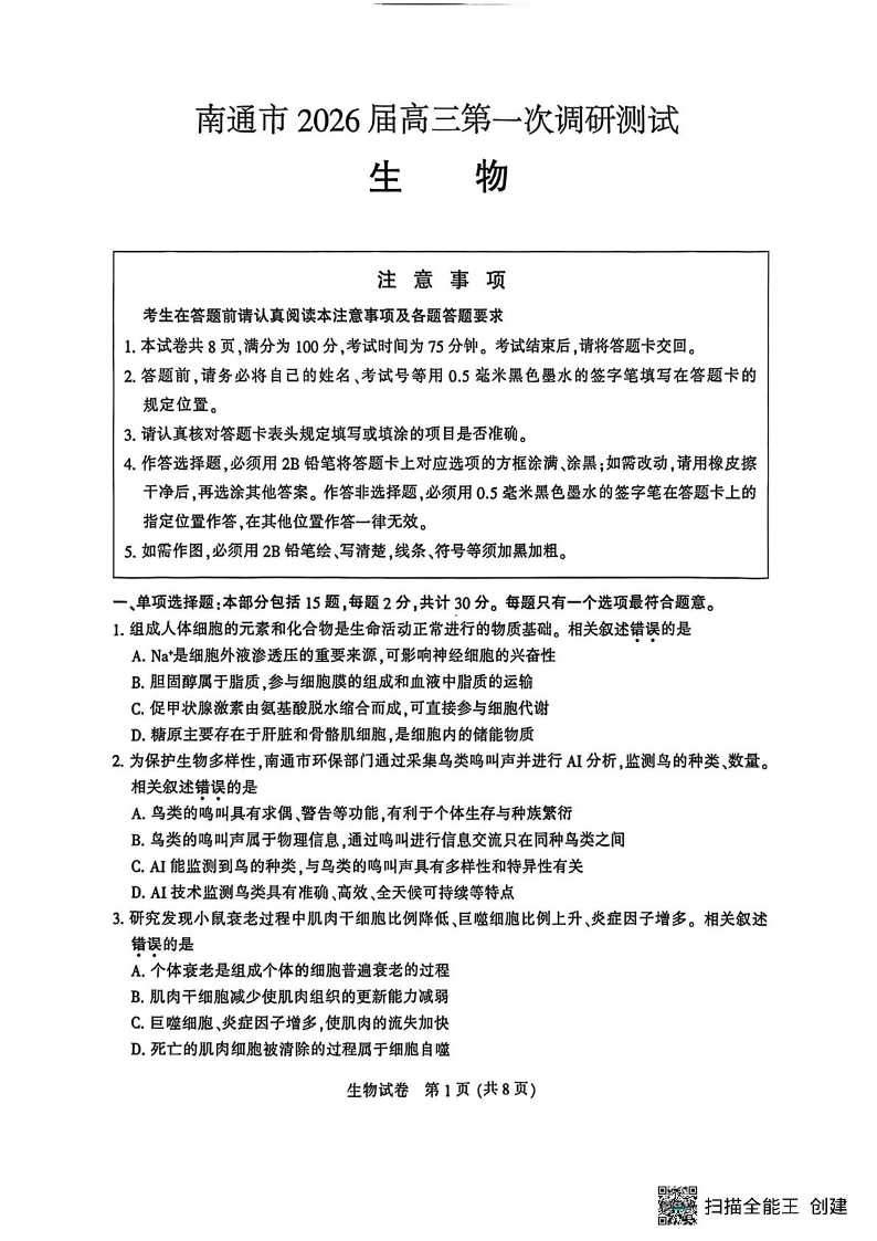 江苏省苏北七市2026届高三下学期第二次调研测试 生物.pdf