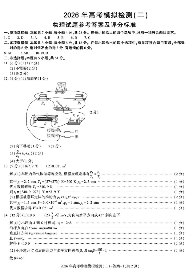 咸阳市2026年高考模拟检测(二)物理答案.pdf