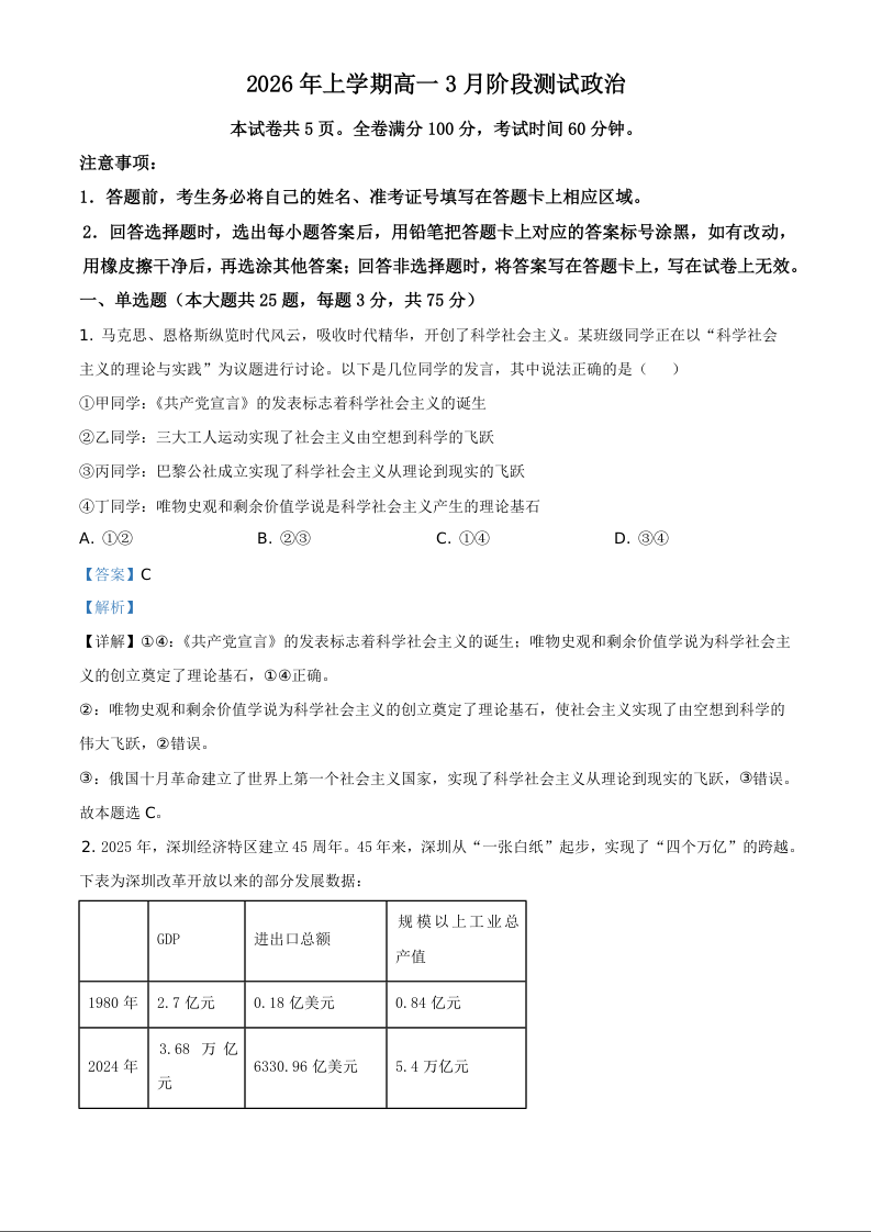 湖南省长沙市明德中学2025-2026学年高一下学期3月月考 政治答案.docx