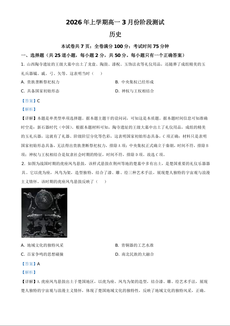湖南省长沙市明德中学2025-2026学年高一下学期3月月考 历史答案.docx