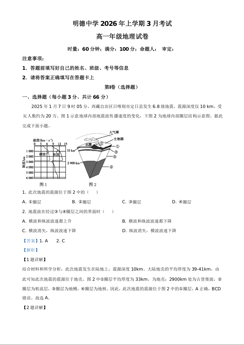 湖南省长沙市明德中学2025-2026学年高一下学期3月月考 地理答案.docx