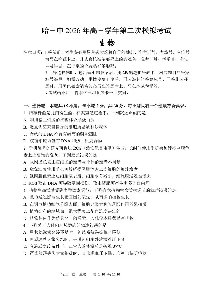 哈三中2026年高三学年第二次模拟考试 生物.pdf