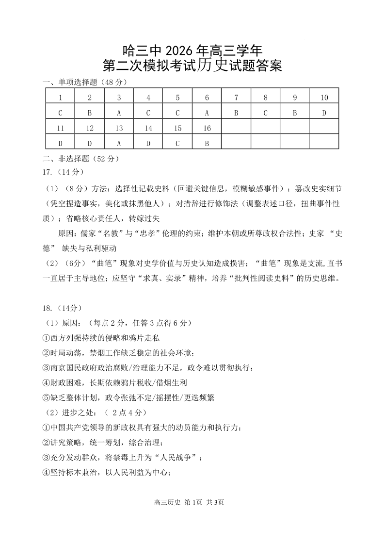 哈三中2026年高三学年第二次模拟考试 历史答案.pdf