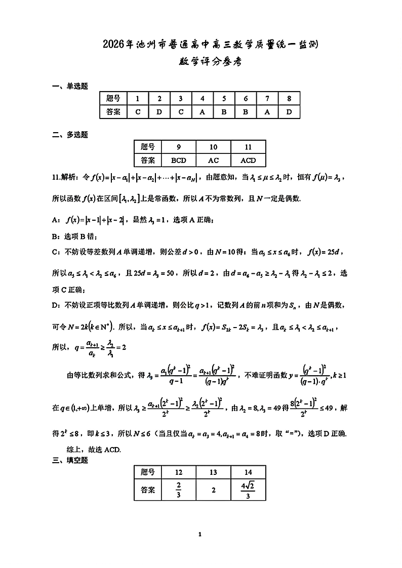 安徽省池州市2026年普通高中高三教学质量统一监测 数学答案.pdf