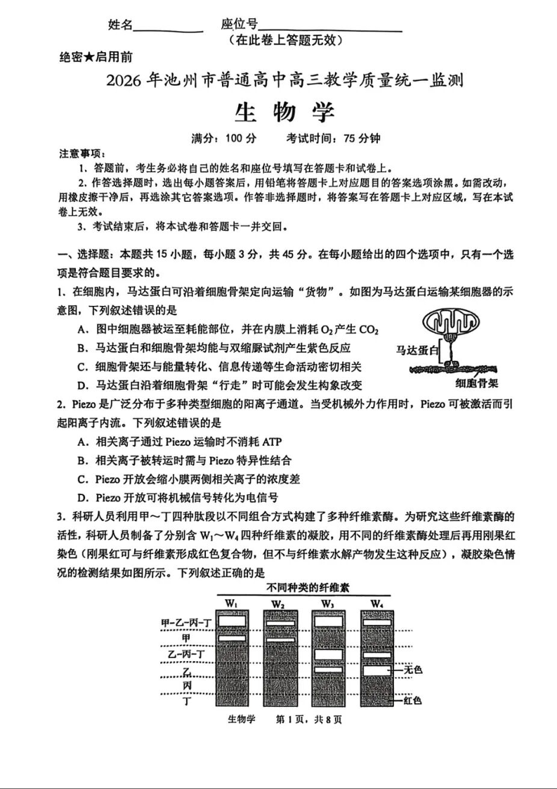 安徽省池州市2026年普通高中高三教学质量统一监测 生物.docx