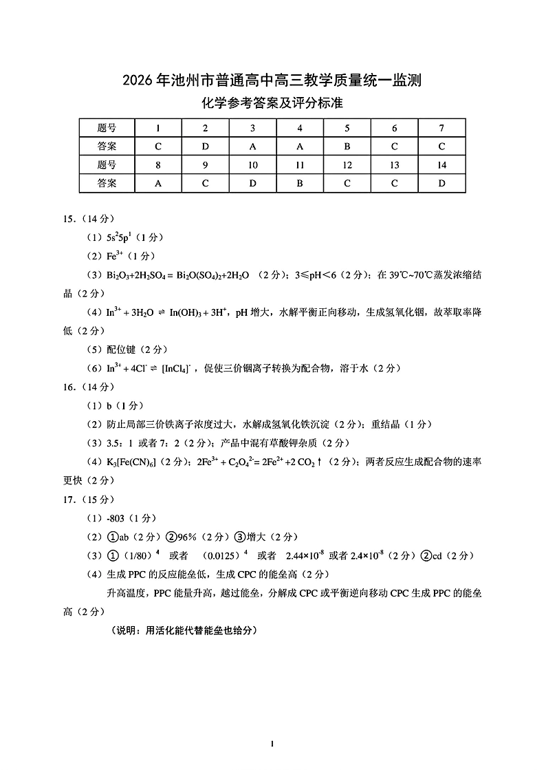 安徽省池州市2026年普通高中高三教学质量统一监测 化学答案.pdf