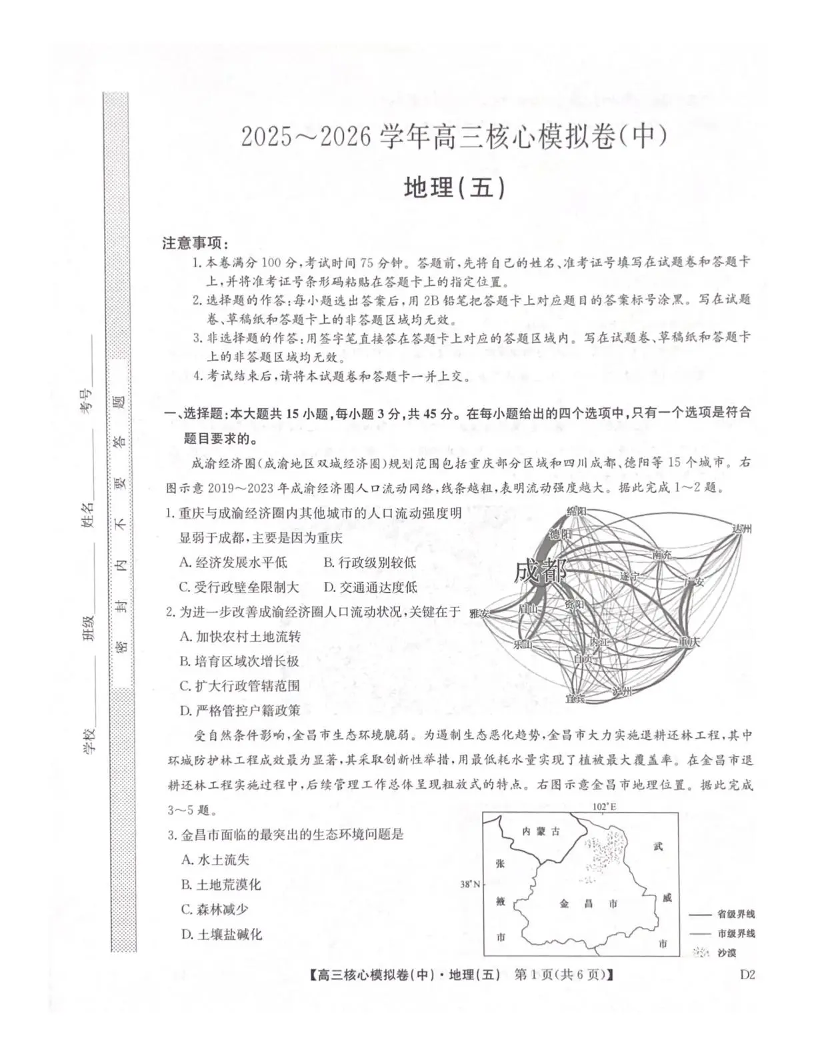 2025~2026学年高三核心模拟卷(五)地理.pdf