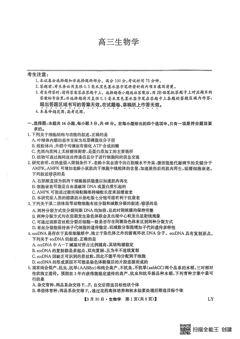 九师联盟2026届高三下学期3月30日质量检测 生物.pdf