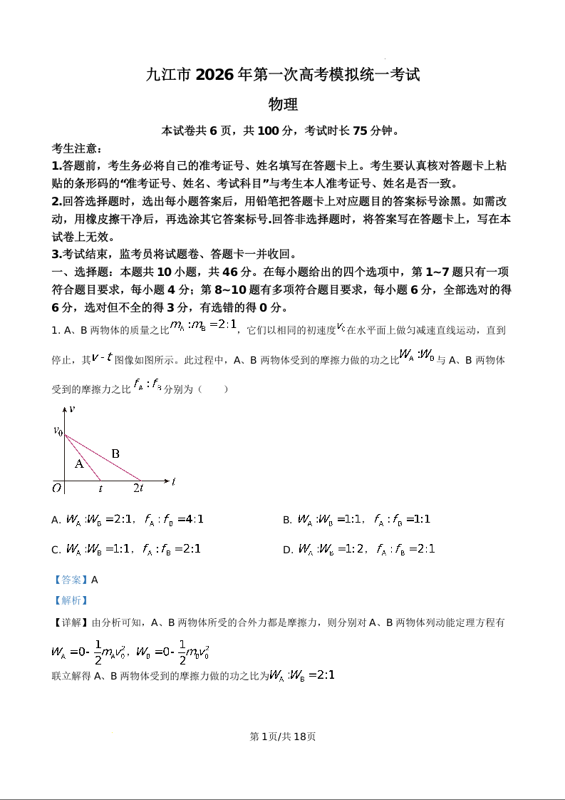 江西省九江市2026届高三第一次高考模拟统一考试 物理答案.docx