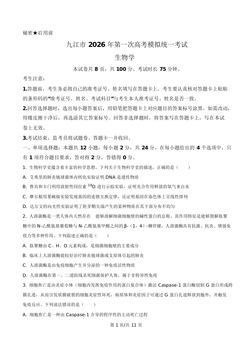 江西省九江市2026届高三第一次高考模拟统一考试 生物.docx