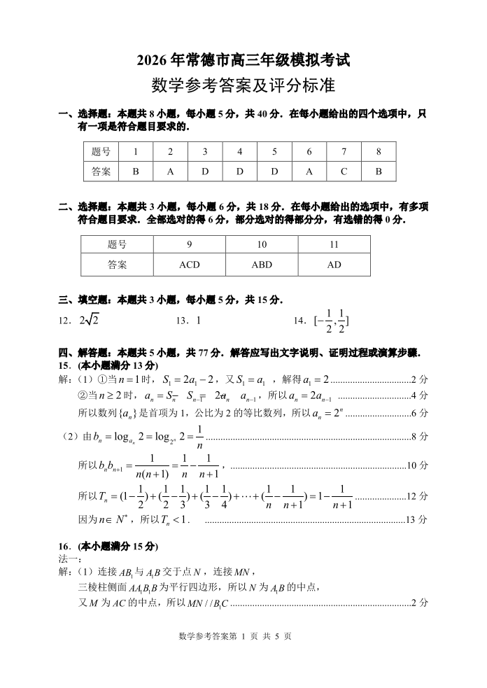 湖南省常德市2026年高三年级3月模拟考试 数学答案.pdf