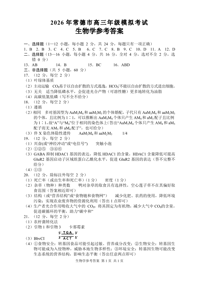 湖南省常德市2026年高三年级3月模拟考试 生物答案.pdf