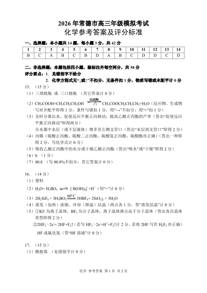 湖南省常德市2026年高三年级3月模拟考试 化学答案.pdf
