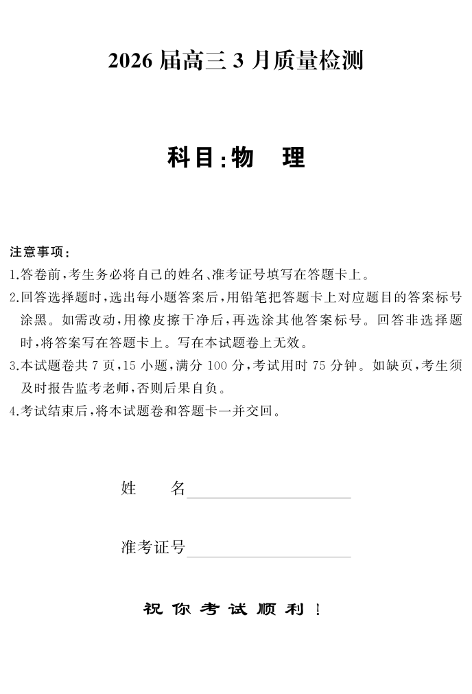 天壹名校联盟2026届高三3月质量检测 物理.pdf