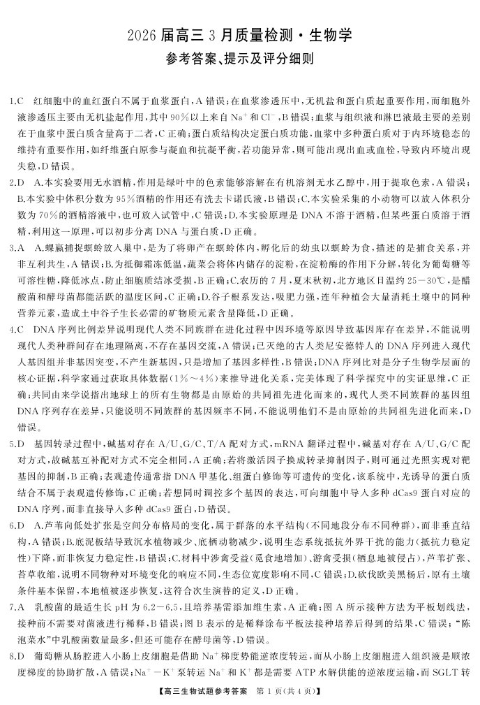 天壹名校联盟2026届高三3月质量检测 生物答案.pdf
