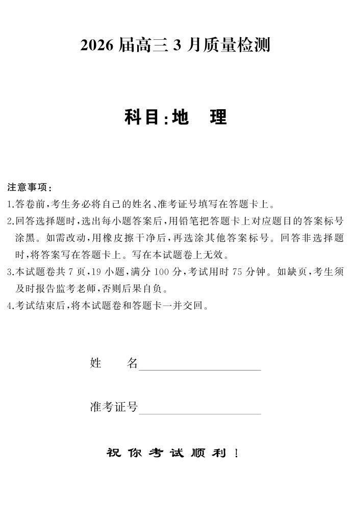 天壹名校联盟2026届高三3月质量检测 地理.pdf