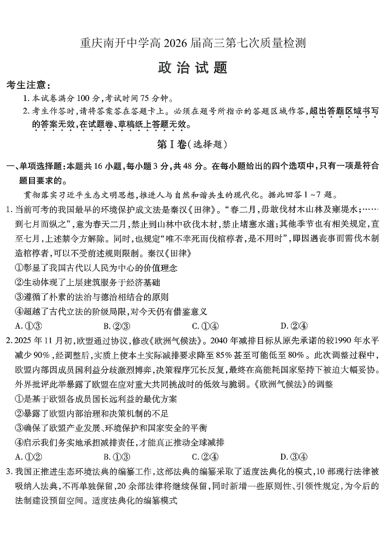 重庆市南开中学高2026届高三第七次质量检测 政治.pdf