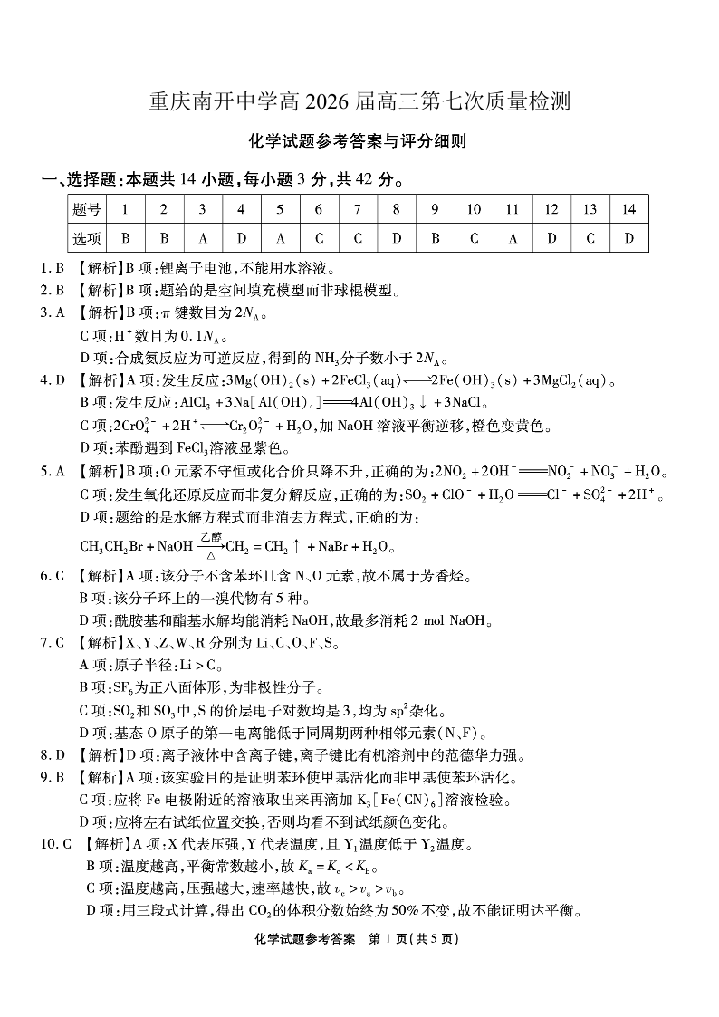 重庆市南开中学高2026届高三第七次质量检测 化学答案.pdf
