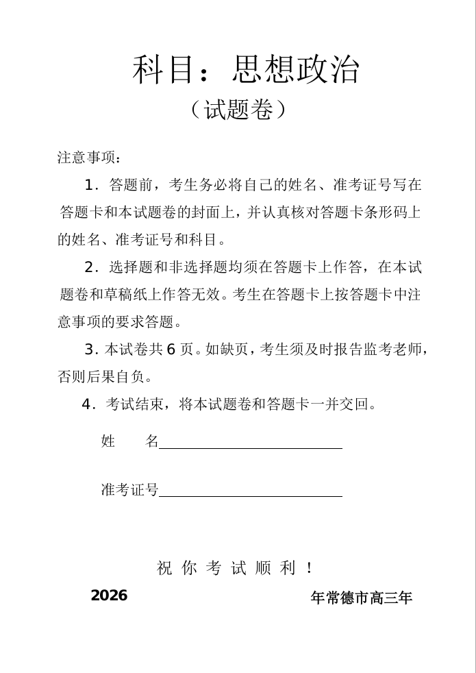 湖南省常德市2026年高三年级3月模拟考试 政治.doc