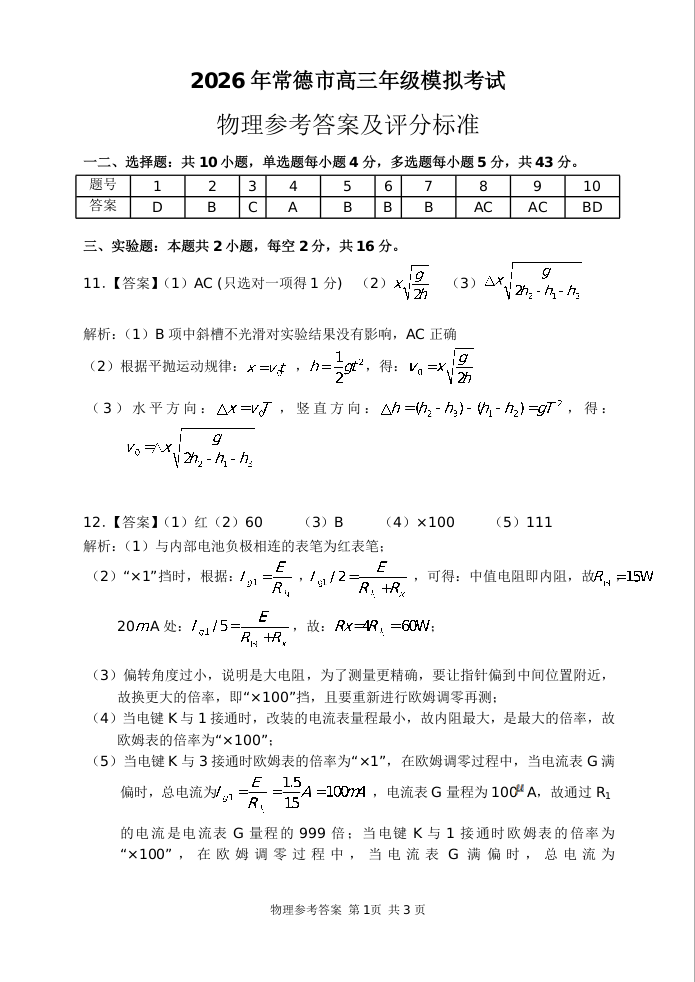湖南省常德市2026年高三年级3月模拟考试 物理答案.doc