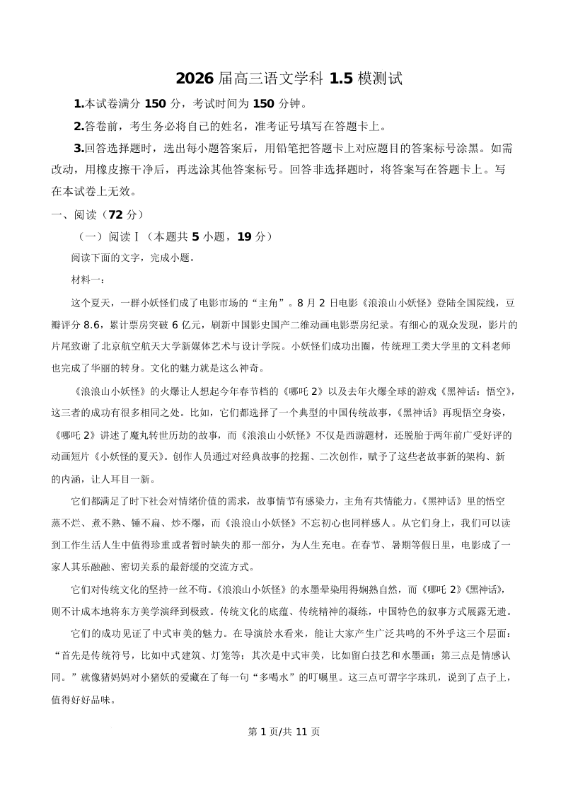 黑龙江省双鸭山市第一中学2026届高三下学期3月模拟考试 语文.docx