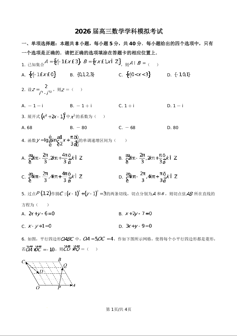黑龙江省双鸭山市第一中学2026届高三下学期3月模拟考试 数学.docx