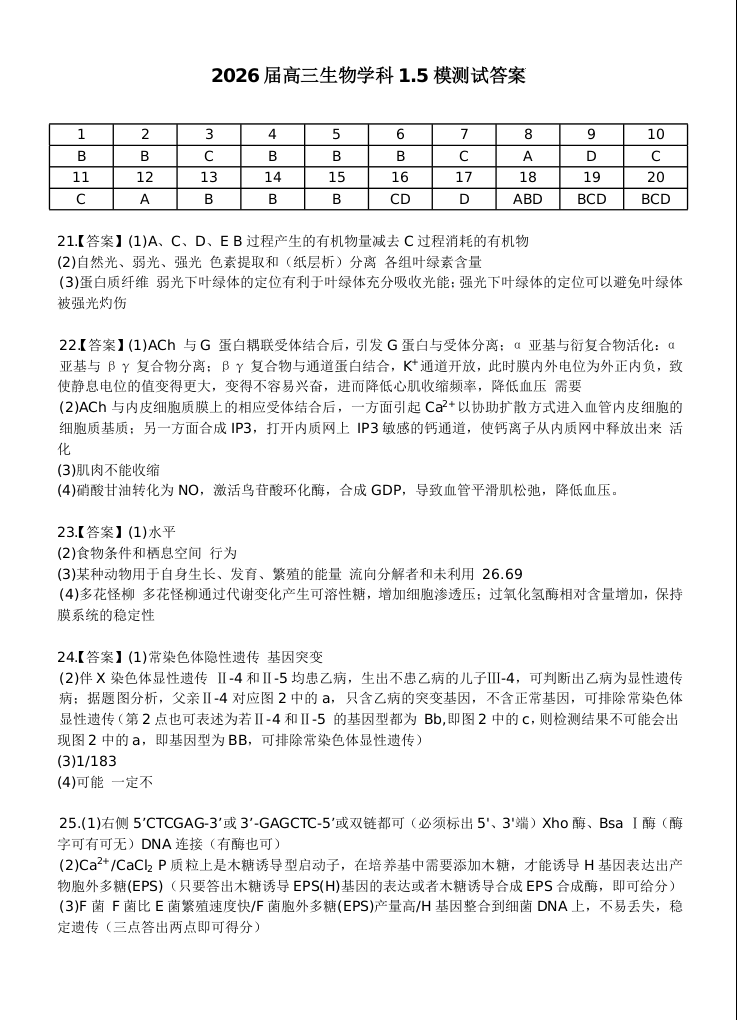 黑龙江省双鸭山市第一中学2026届高三下学期3月模拟考试 生物答案.docx