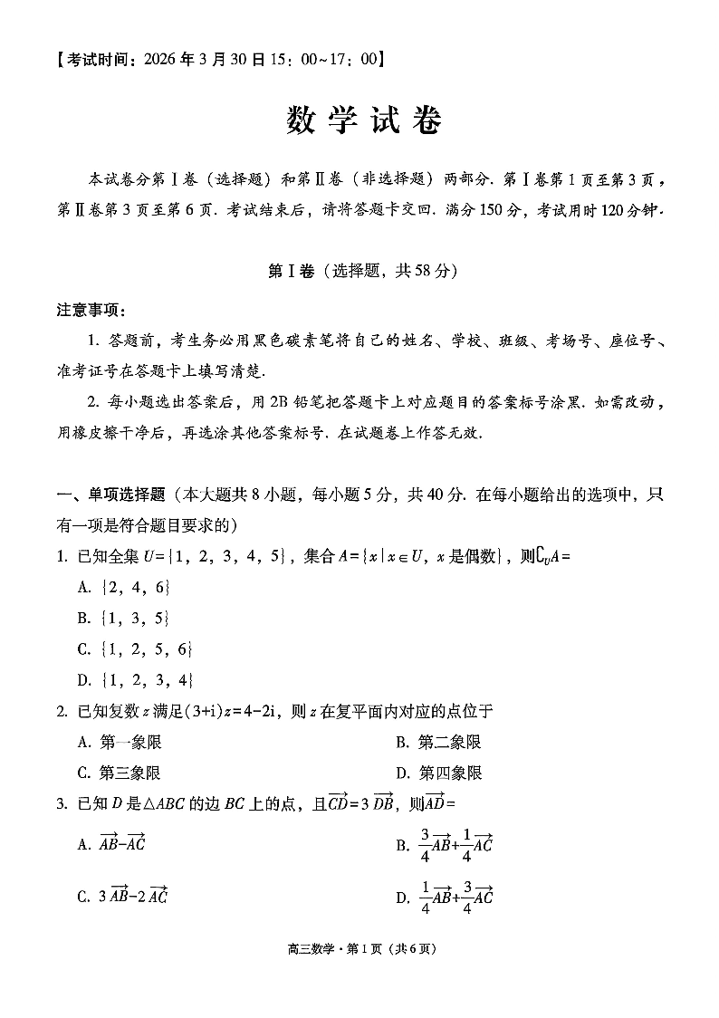 昭通市2025-2026学年高三下学期3月统一测试 数学.pdf