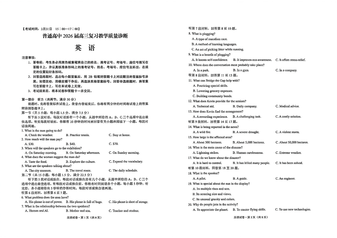 普通高中2026届高三复习教学质量诊断 英语试题 (含答案).pdf