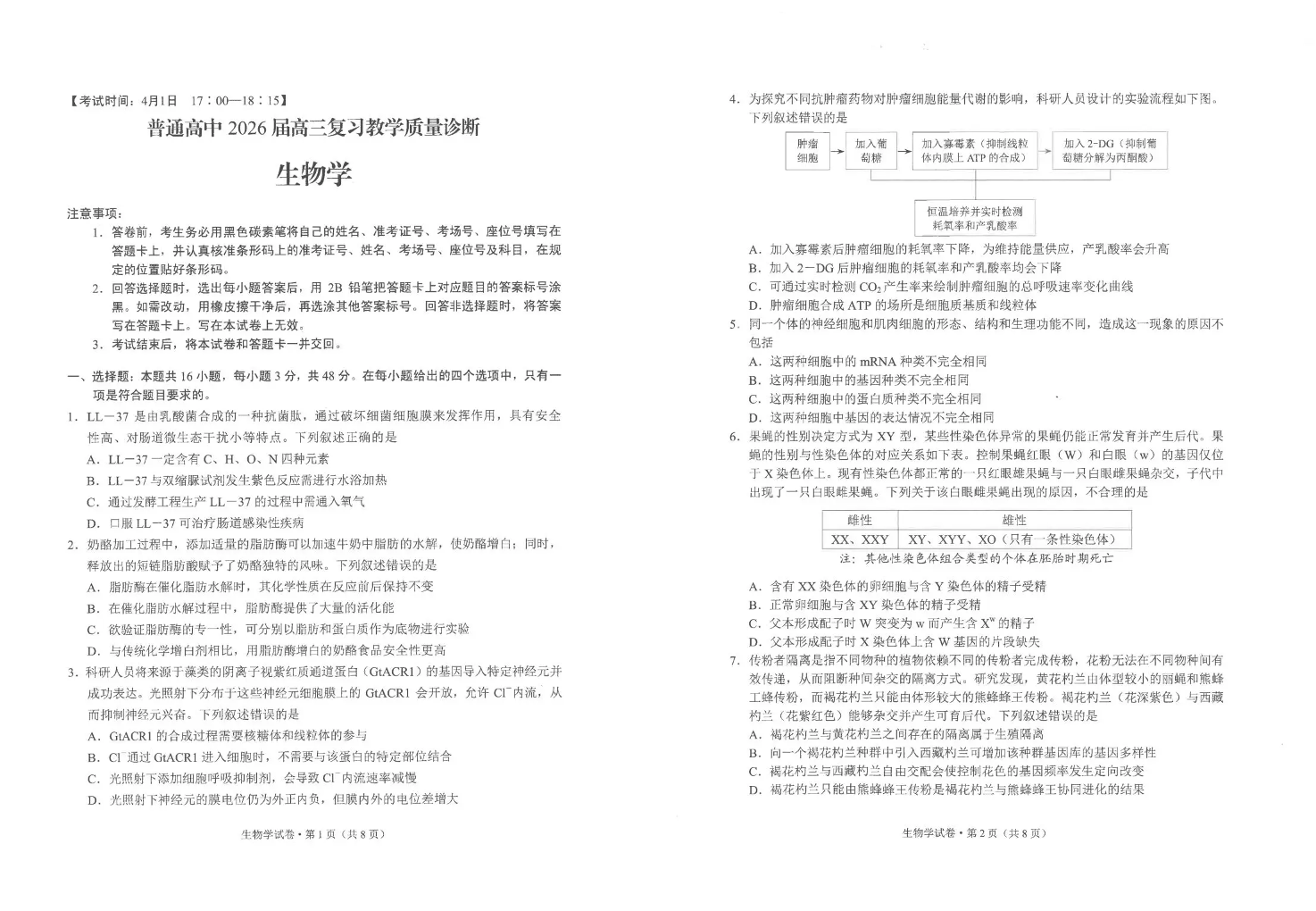普通高中2026届高三复习教学质量诊断 生物试题 (含答案).pdf