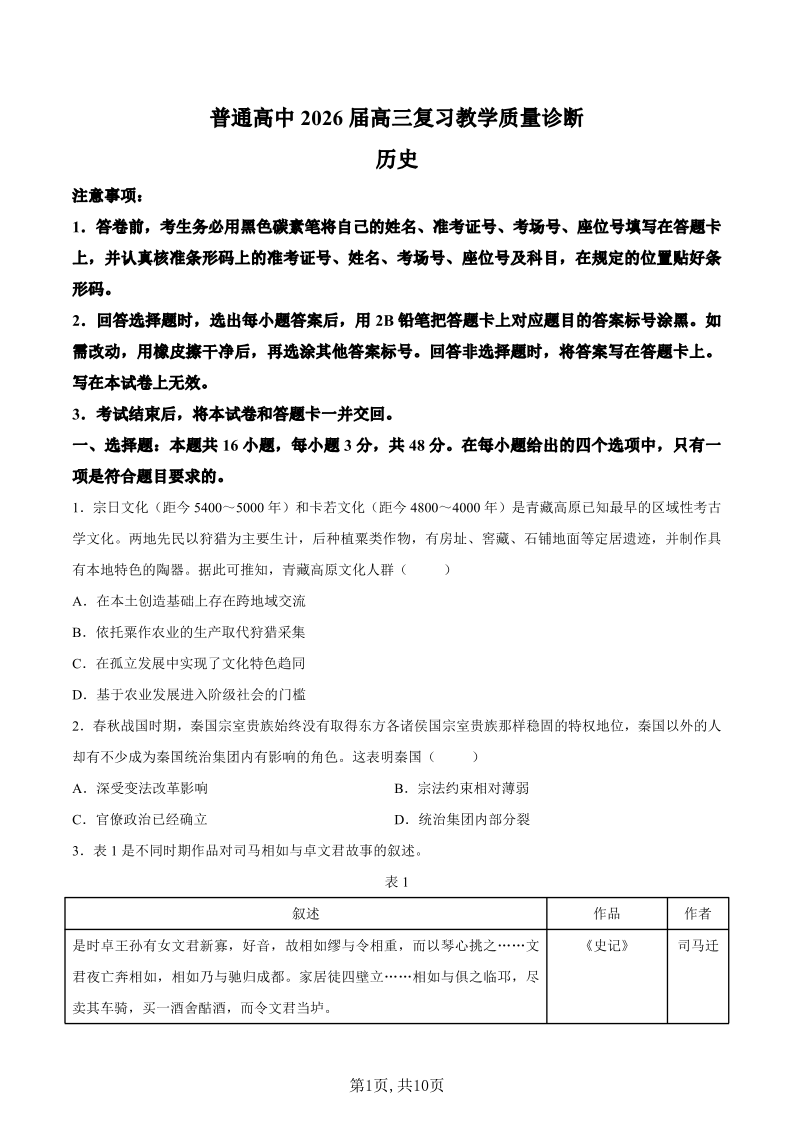 普通高中2026届高三复习教学质量诊断 历史试题 (含答案).pdf