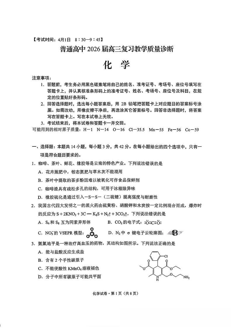 普通高中2026届高三复习教学质量诊断 化学试题 (含答案).pdf