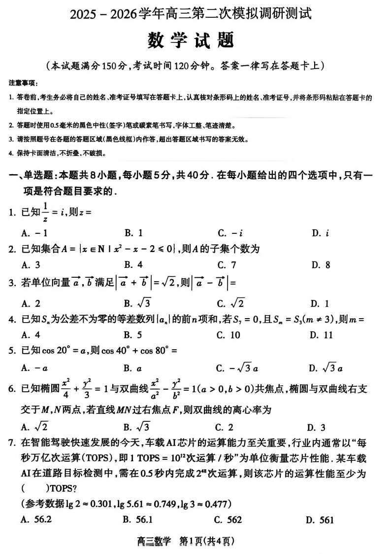吕梁市2025-2026学年高三第二次模拟调研测试 数学.pdf