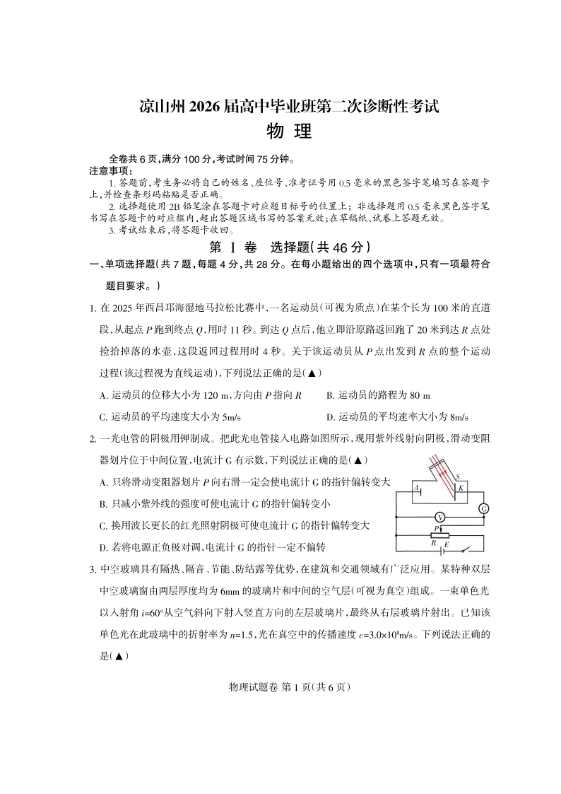 凉山州2026届高中毕业班第二次诊断性考试 物理.pdf