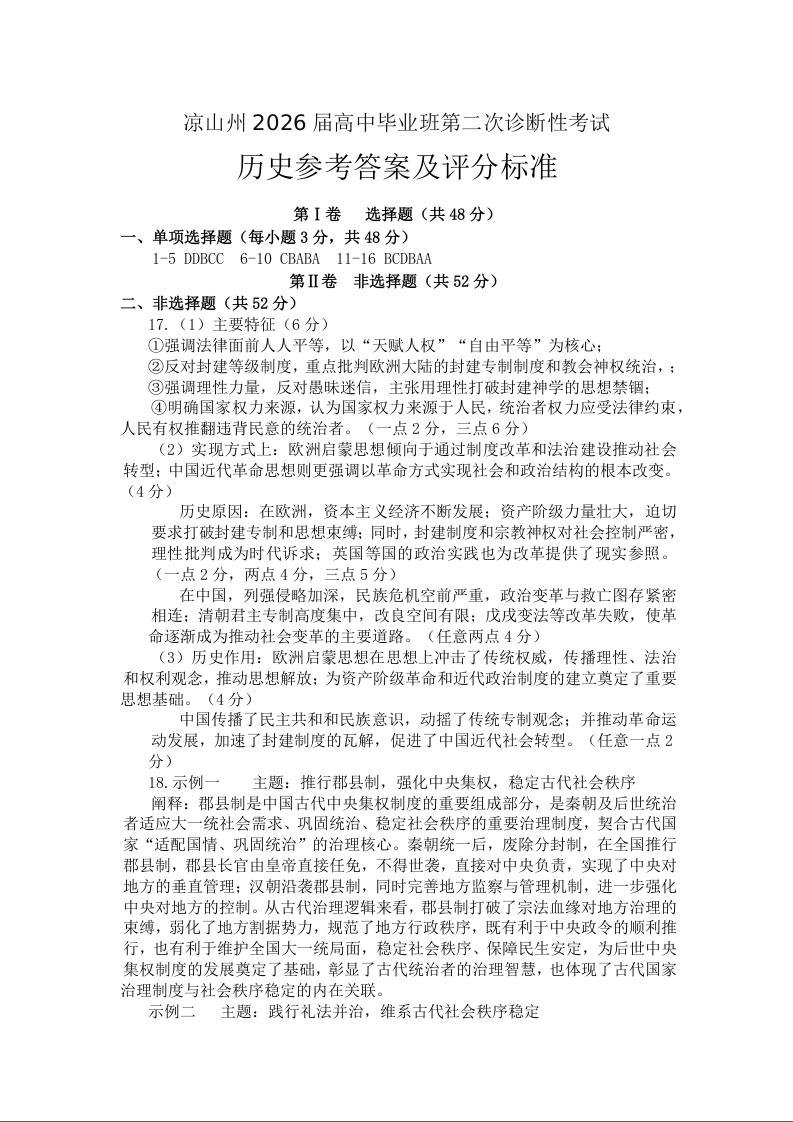 凉山州2026届高中毕业班第二次诊断性考试 历史答案.docx