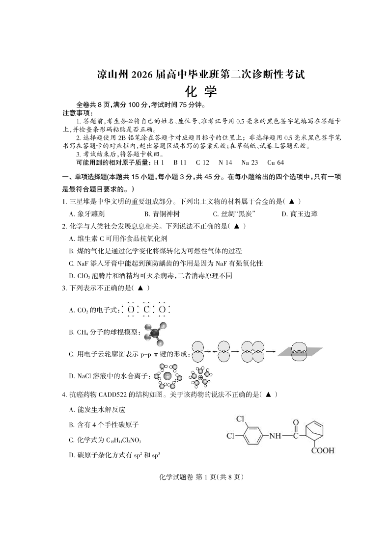 凉山州2026届高中毕业班第二次诊断性考试 化学.pdf