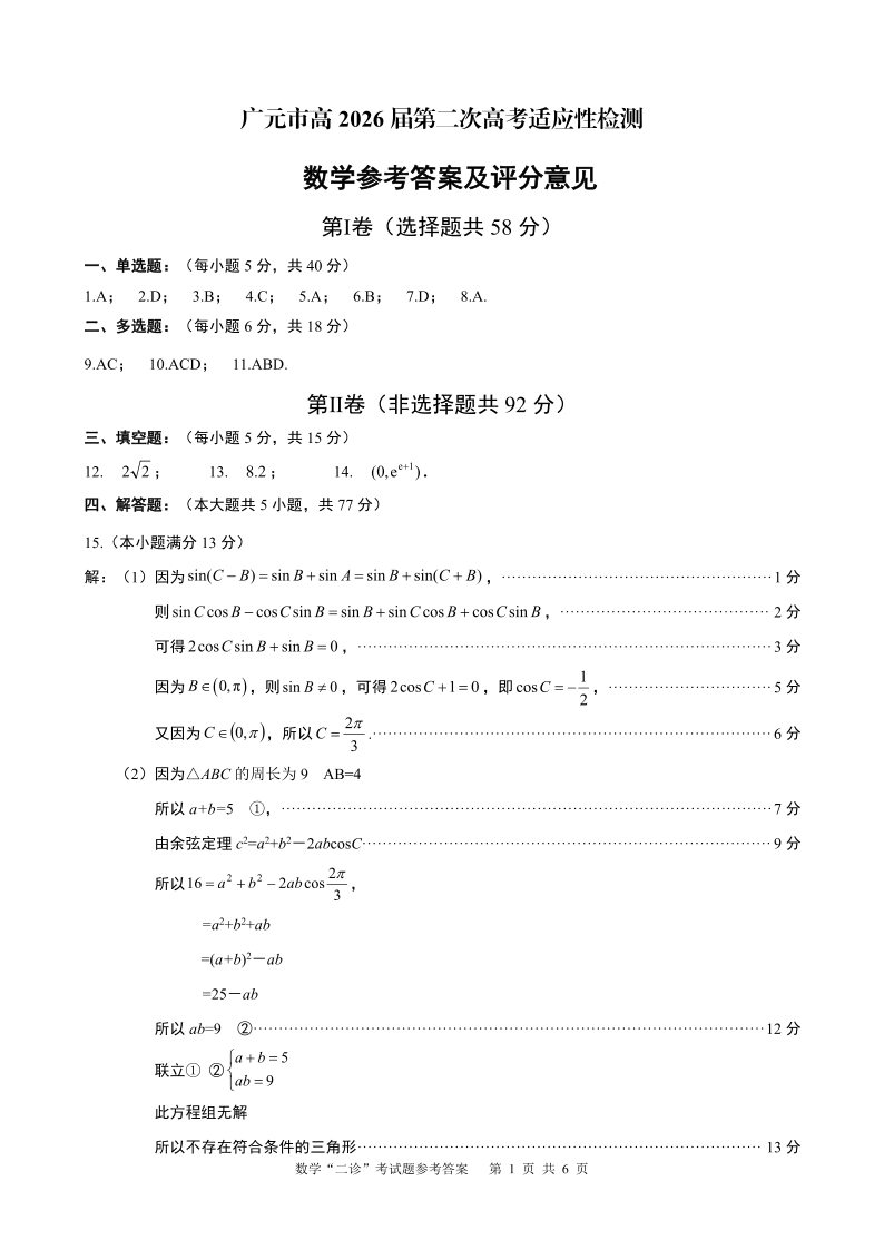 广元市高2026届第二次高考适应性检测 数学答案.pdf