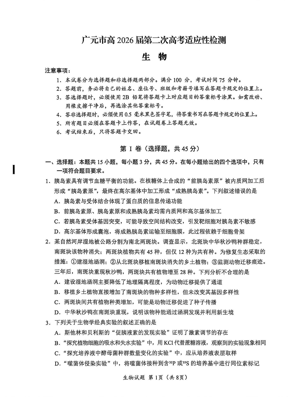 广元市高2026届第二次高考适应性检测 生物.pdf