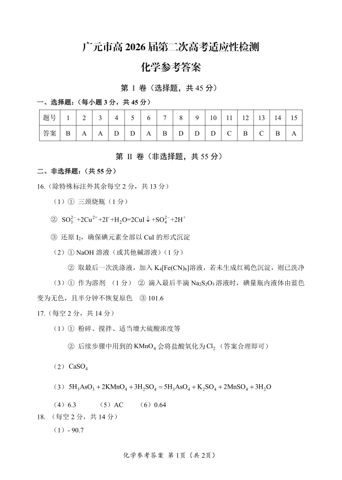 广元市高2026届第二次高考适应性检测 化学答案.pdf
