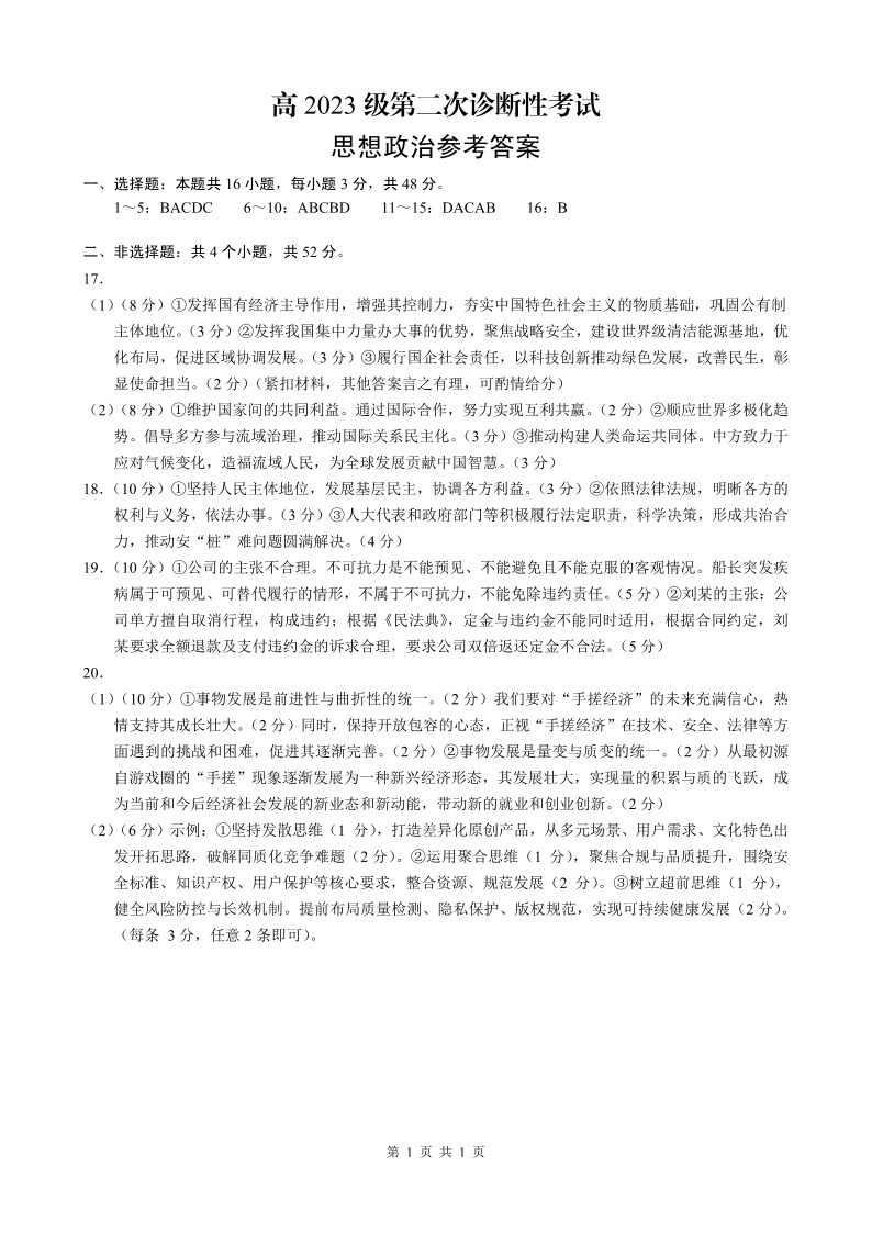 广安市高2023级第二次模拟考试 政治答案.pdf