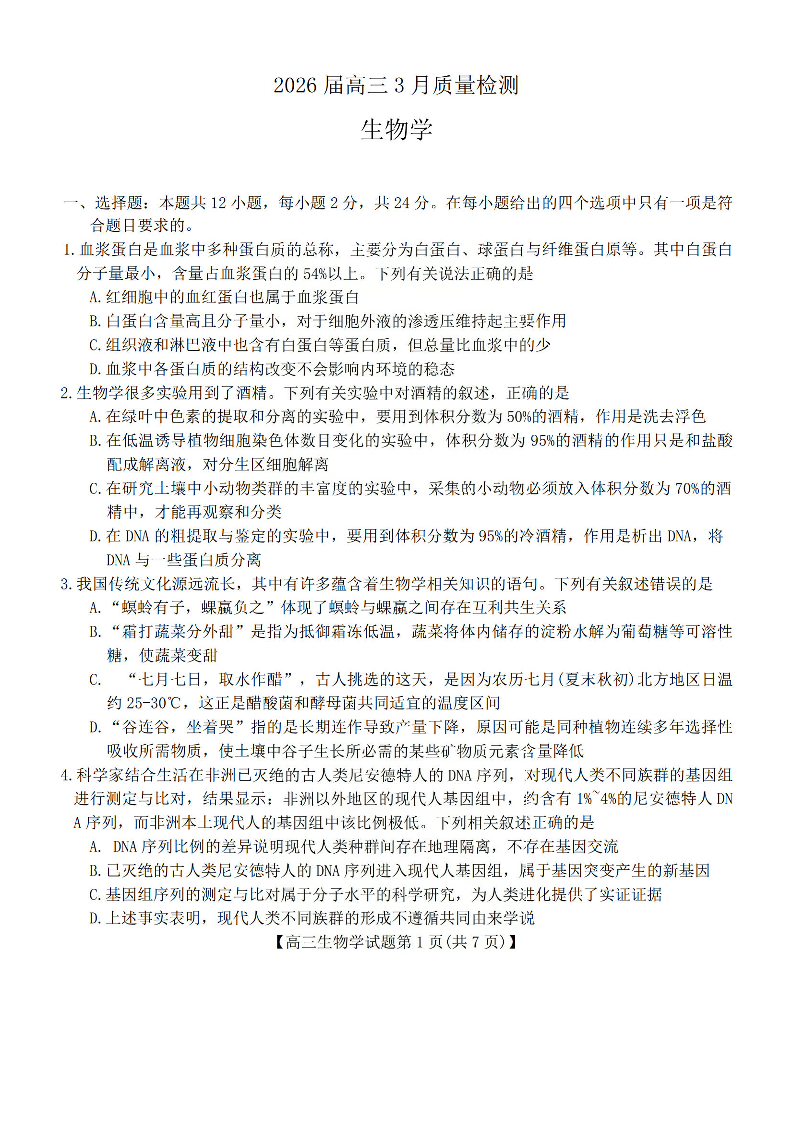 湖南省湘西州、湘潭市2026届高三3月质量检测 生物.pdf