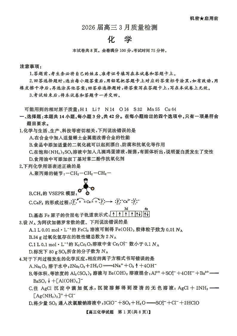 湖南省湘西州、湘潭市2026届高三3月质量检测 化学.pdf