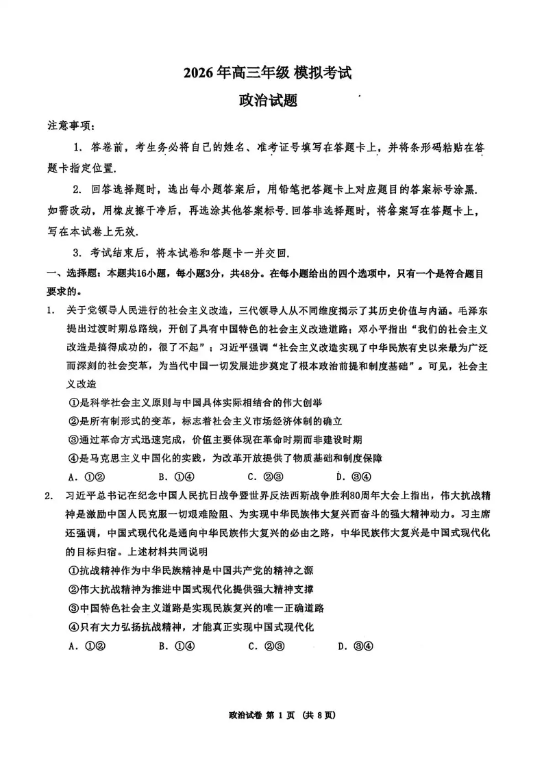 东北三省三校2026届高三下学期第二次模拟考试 政治.pdf