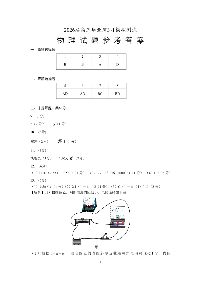 厦门市2026届高中毕业班模拟测试 物理答案.pdf