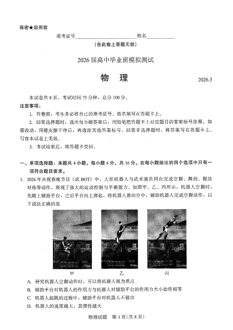 厦门市2026届高中毕业班模拟测试 物理.pdf