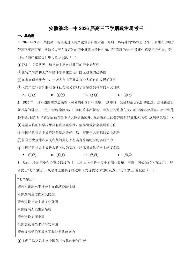 安徽省淮北市第一中学2026届高三下学期周考(三)政治试题(含答案).pdf